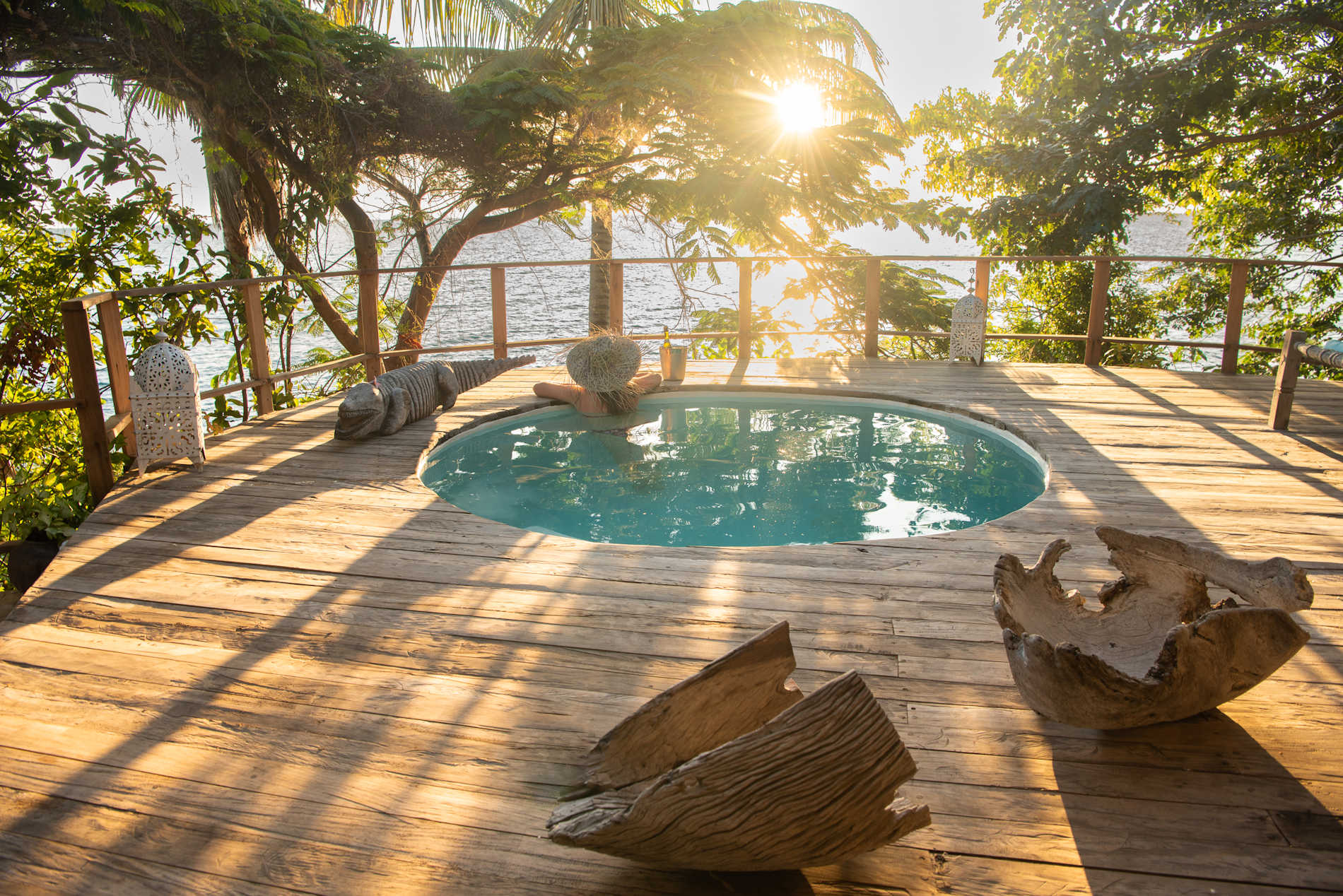 Jedes Cottage verfügt über ein großes Moskitonetz sowie eine Privatterrasse, von der aus es einen Zugang zum See gibt, einer vertieften Steinwanne und einem Badezimmer mit einem fantastischen Ausblick.