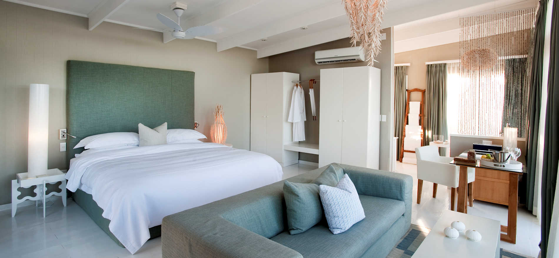 Über die großen Glastüren erreicht man die Terrasse (mit Meerblick). Die Suite hat eine Außendusche und ein luxuriöses, sehr stilvolles Bad, sowie einen wunderschönen Wohn- und Schlafbereich.
