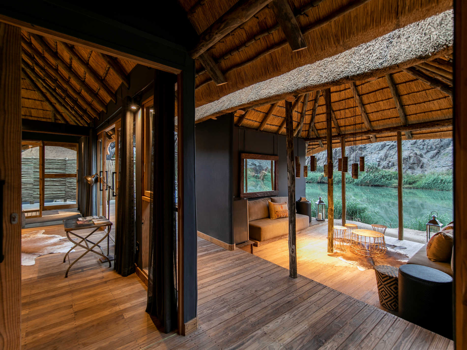Die Chalets sind durch schwere ocker-rote Vorhänge in die drei Bereiche Schlaf- und Wohnraum, Ankleidezimmer und Badezimmer mit Innen- und Außendusche eingeteilt und sind entweder mit Blick auf den Fluss oder zu den Bergen hin ausgerichtet.