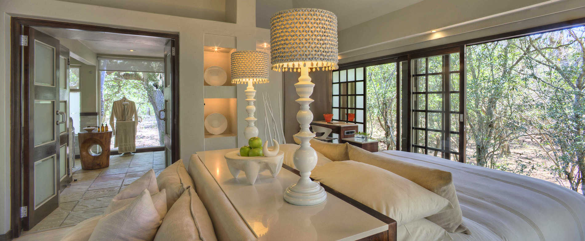 Erfinderisch entworfen im Zulu Zen-Stil ist jede per Hand errichtete, von glasumgebene Suite eine Kombination aus großen Glasflächen, Holz und minimalistischem Design, Hochglanz-Holzböden, reich fühlbaren Stoffen und karminroten Zuluartefakten. Hier haben Sie das Gefühl mitten im Busch zu sein.